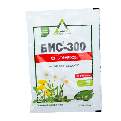 БИС-300 – системный гербицид избирательного действия от сорняков на газоне и землянике. Это наиболее удобный класс химикатов, если нужны точечные и не слишком тщательные обработки. Системные гербициды, в отличие от поверхностных, проникают в ткани растений, распространяются по сосудистой системе и достигают нужных точек воздействия. А их избирательность позволяет уберечь культурные растения. Действующее вещество – 300 г/л клопиралида.
