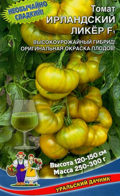 Новый оригинальный гибрид томата, отличающийся от собратьев необычайно сладким вкусом! Среднеранний (110-112 дней от всходов до урожая) для выращивания в теплицах. Растение мощное, крепкое, высотой 120-150 см. Первое соцветие – над 8-9-м. листом, в кисти 3-5 плодов. Плоды крупные, отдельные до 400 г, выравненные, округло-плоские, многокамерные, мясистые, сочные, сахарные. Окраска плодов неярко-зеленая, переходящая по мере созревания в жёлто-зелёную с еле заметными полосками. Гибрид томата Ирландский ликёр F1 превосходит стандартный сорт Малахитовая шкатулка по общему урожаю на 9-11 %, по выходу зрелых плодов на 32 %.